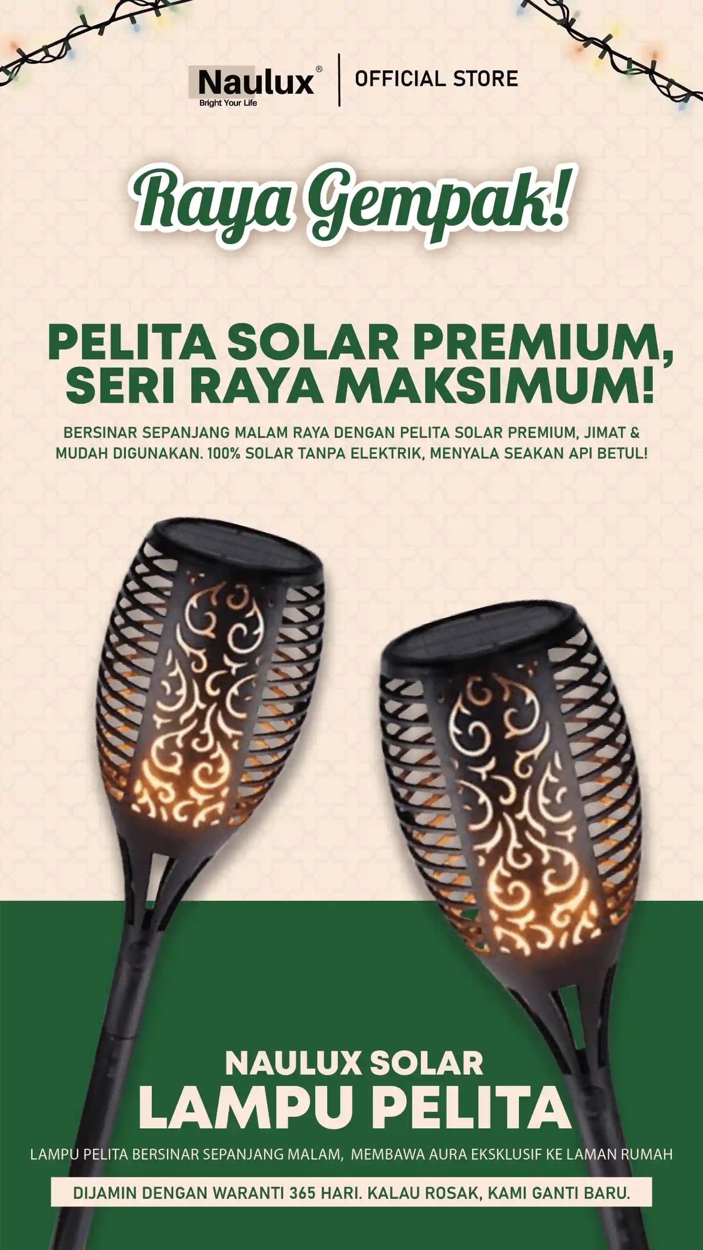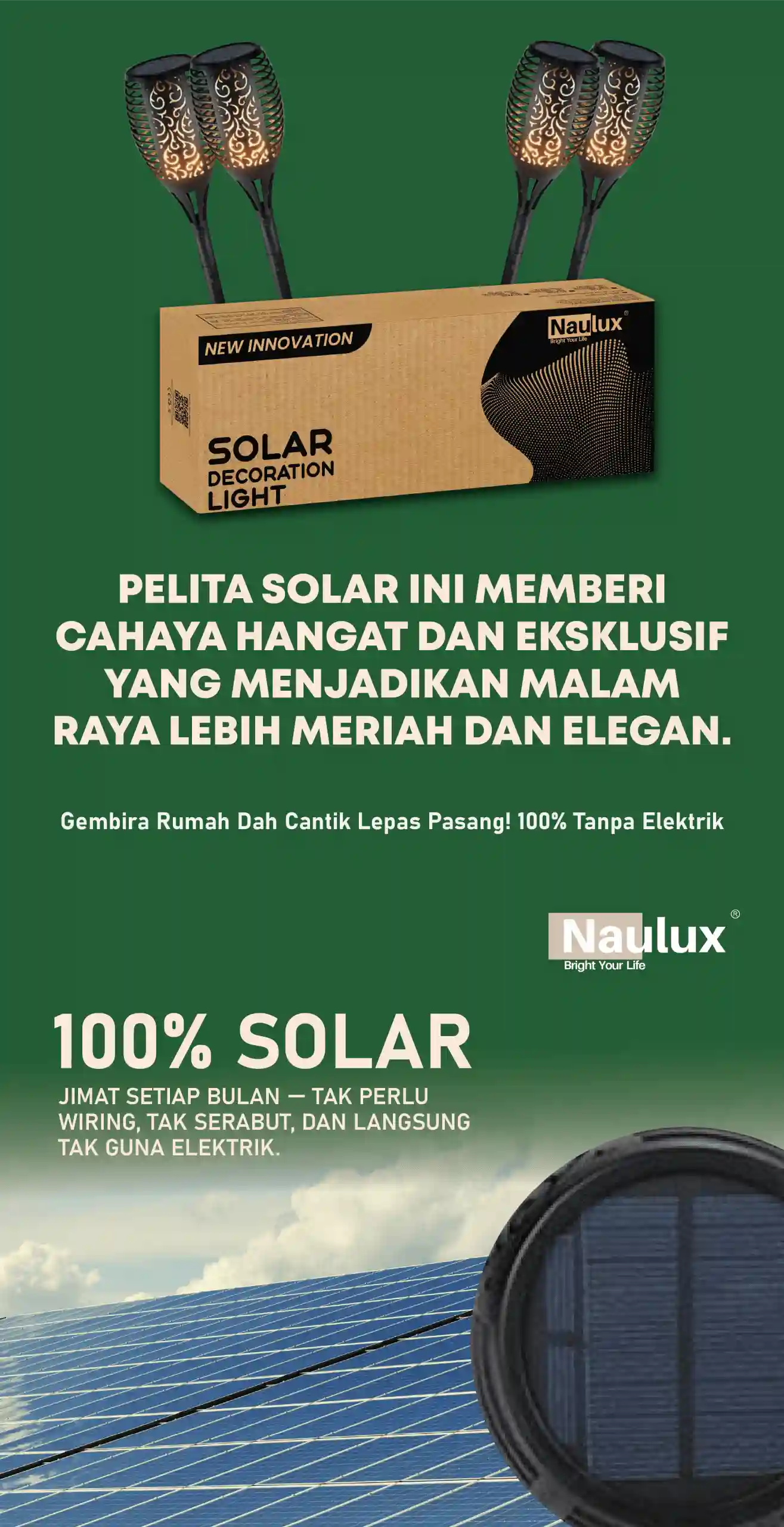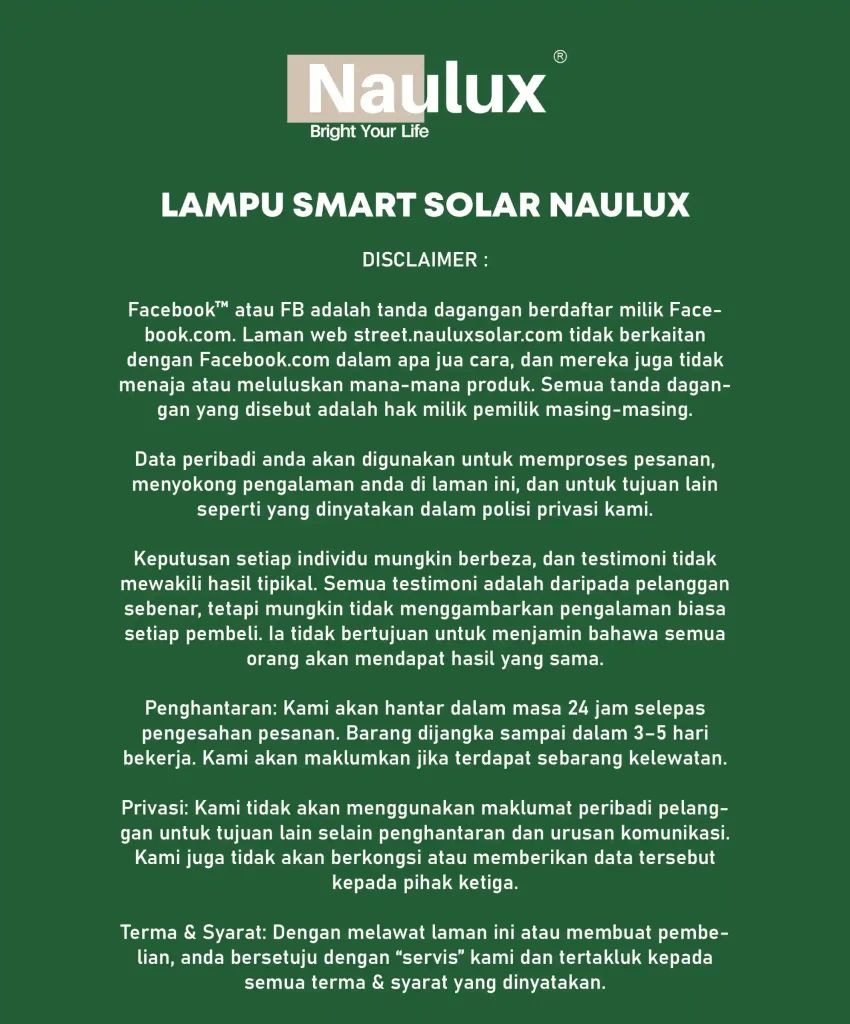 Tidak. Lampu Naulux menggunakan tenaga solar sepenuhnya dan tidak memerlukan sebarang sambungan elektrik.