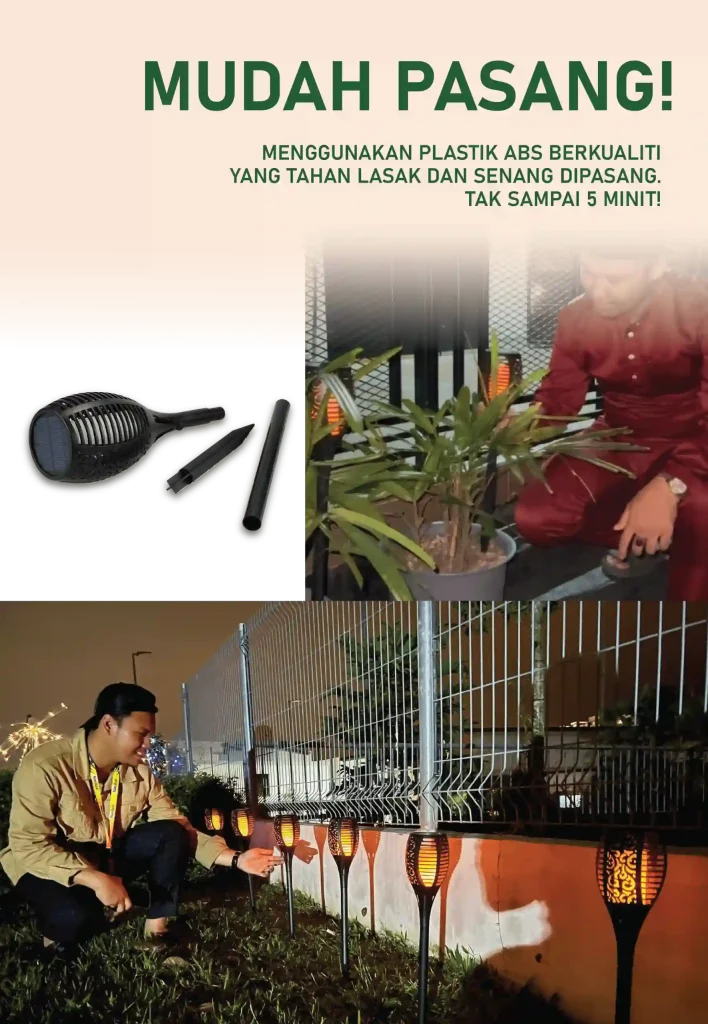 Langsung tak susah. Cuma pasang je dan cucuk pada tanah atau di mana sahaja yang kena cahaya matahari terus. Tak perlu juruteknik elektrik.